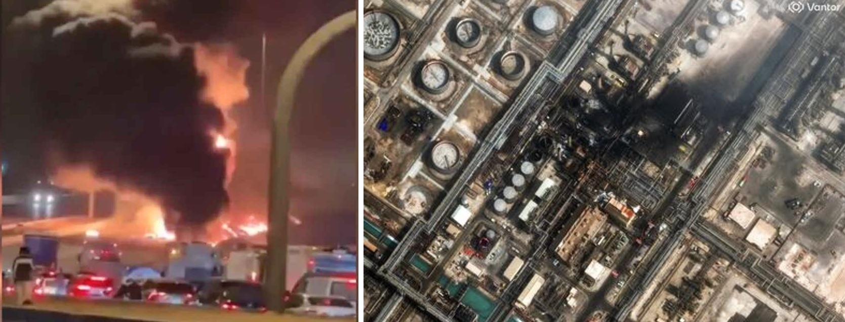 À esquerda, embaixada dos EUA na Arábia Saudita em chamas após ataque de drones iranianos. À direita, destruição em refinaria estatal de petróleo saudita após ataque de mísseis iranianos. O Irã tem reagido aos ataques dos agressores imperialistas.