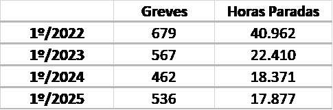 As 536 greves do primeiro semestre de 2025 estão abaixo dos números registrados no mesmo período em 2022 e 2023. Além disso, em relação às horas paradas, 2025 é o ano mais fraco desde 2022, o que indica a predominância de greves curtas ou de meras paralisações de advertência.